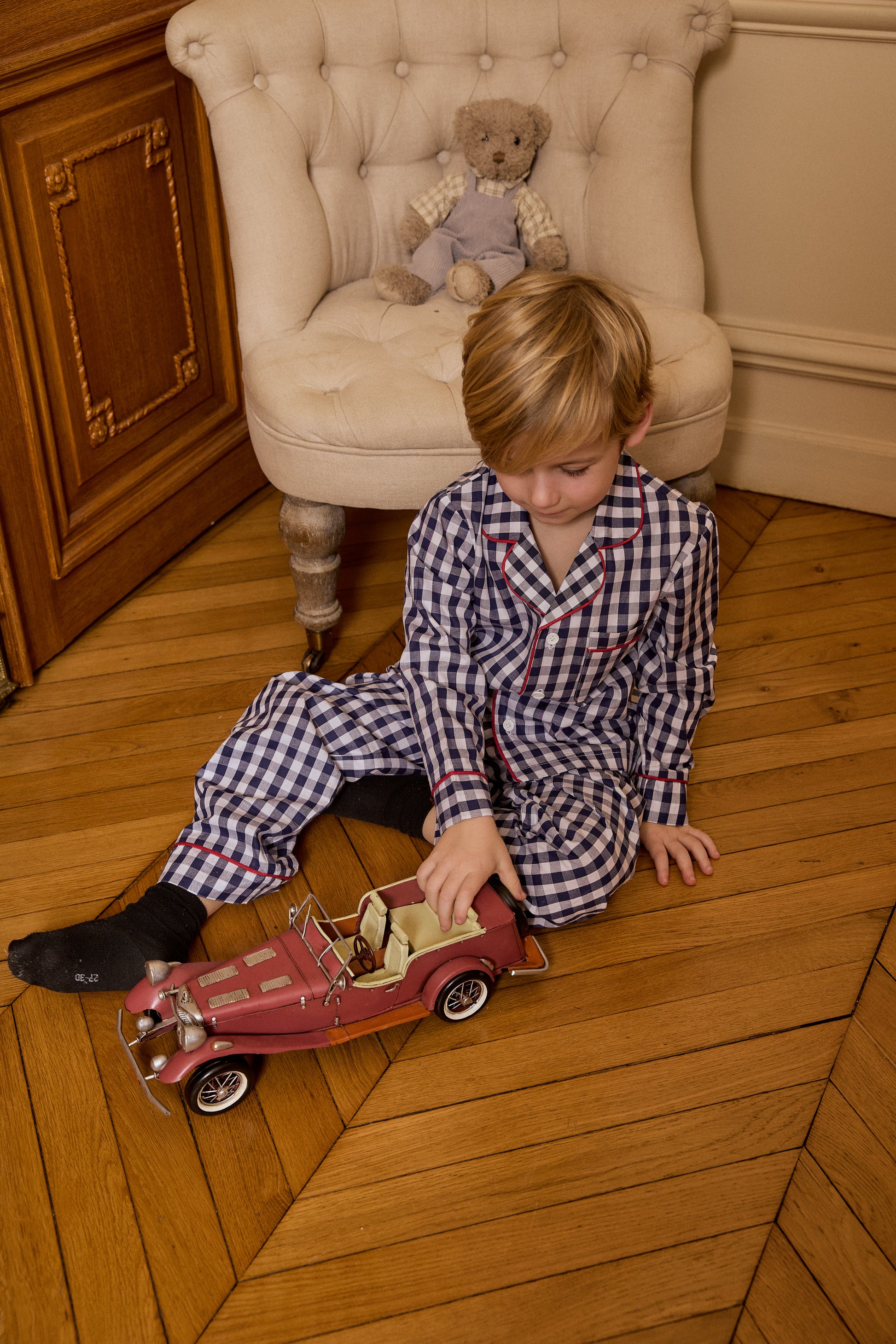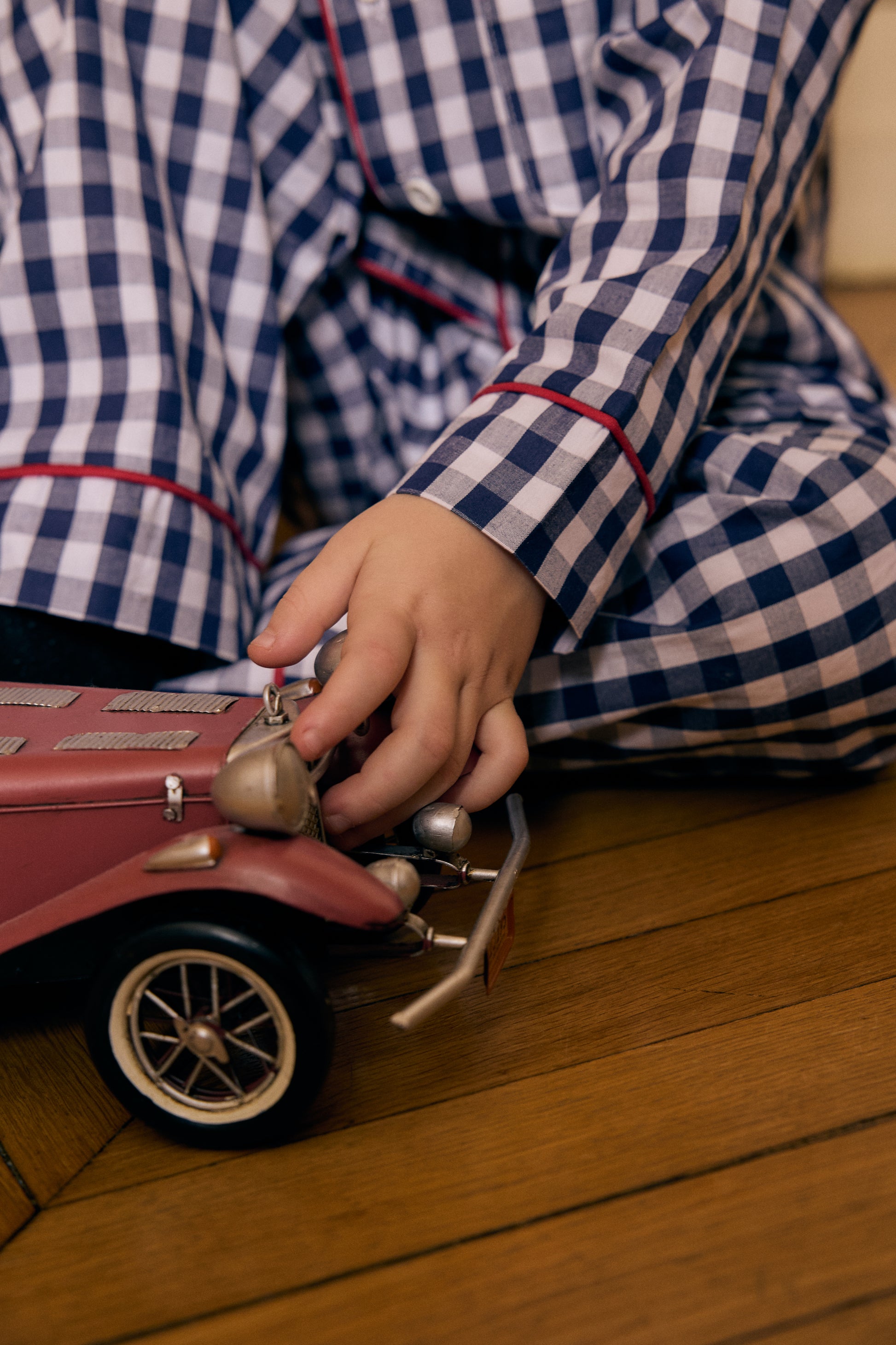 A pajama that channels the softness of a quiet midnight, where little ones dream under warm blankets and everything feels still. Bleu de Minuit combines deep navy checks with delicate red accents, creating a refined yet comforting bedtime classic.