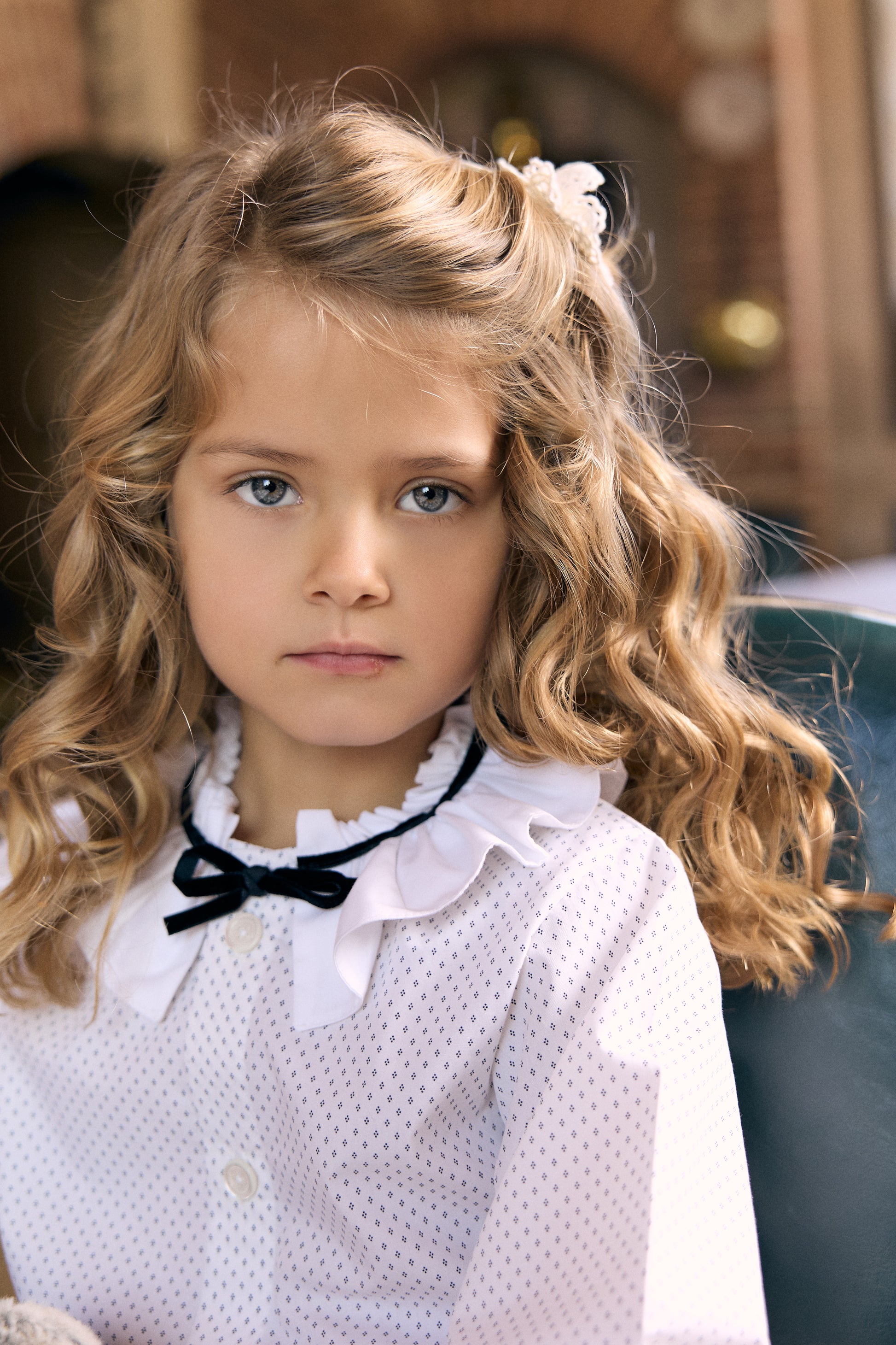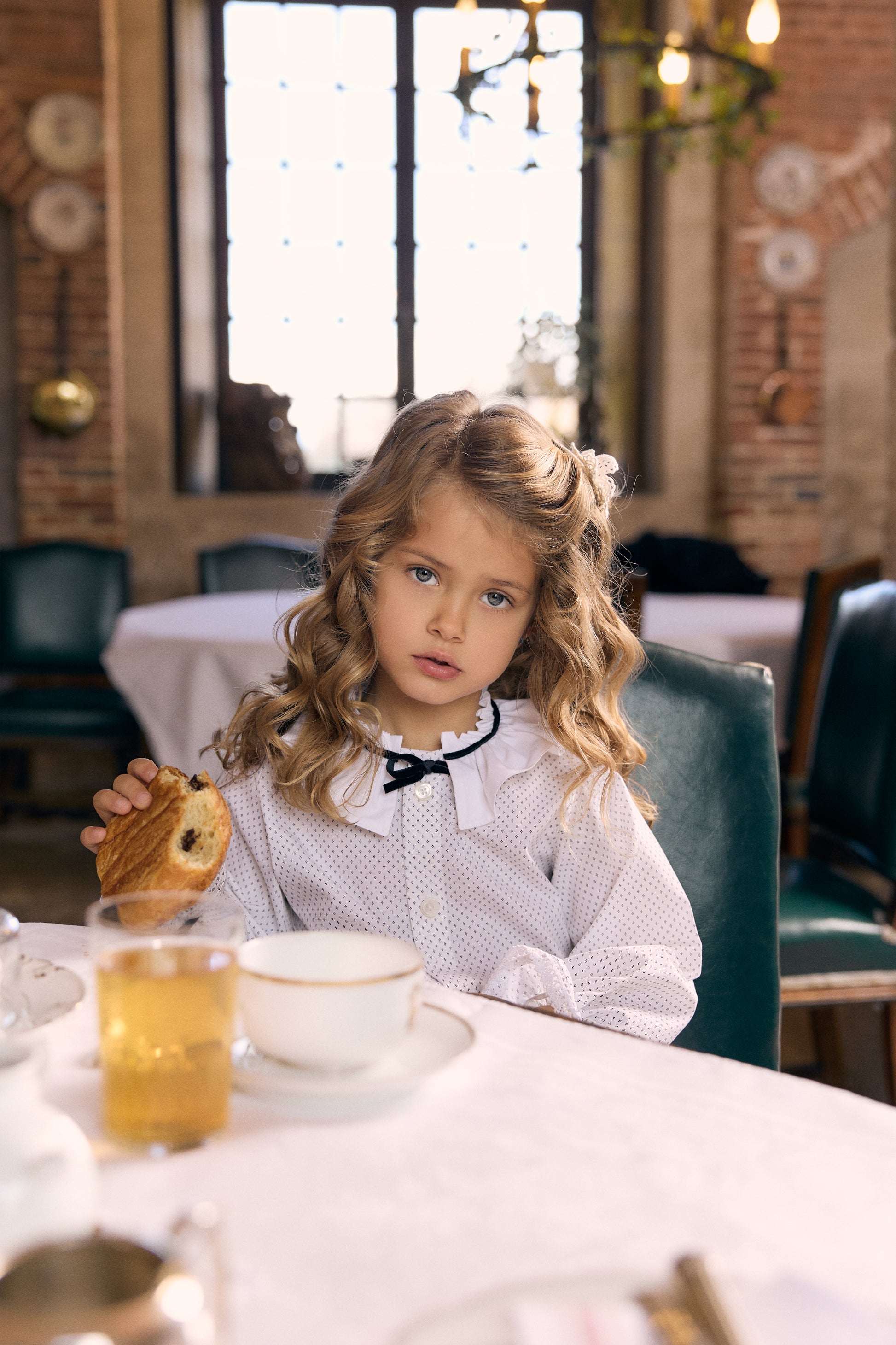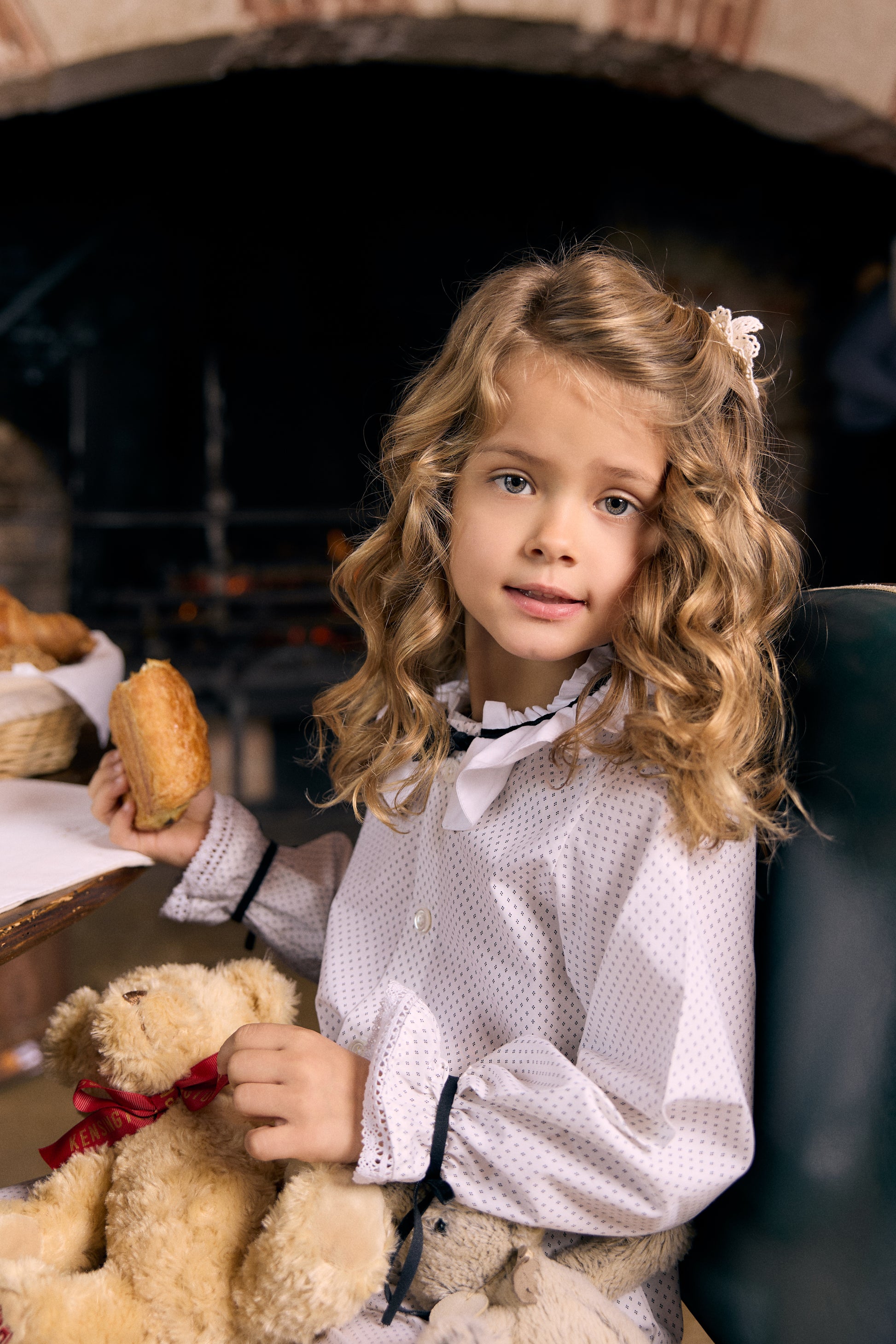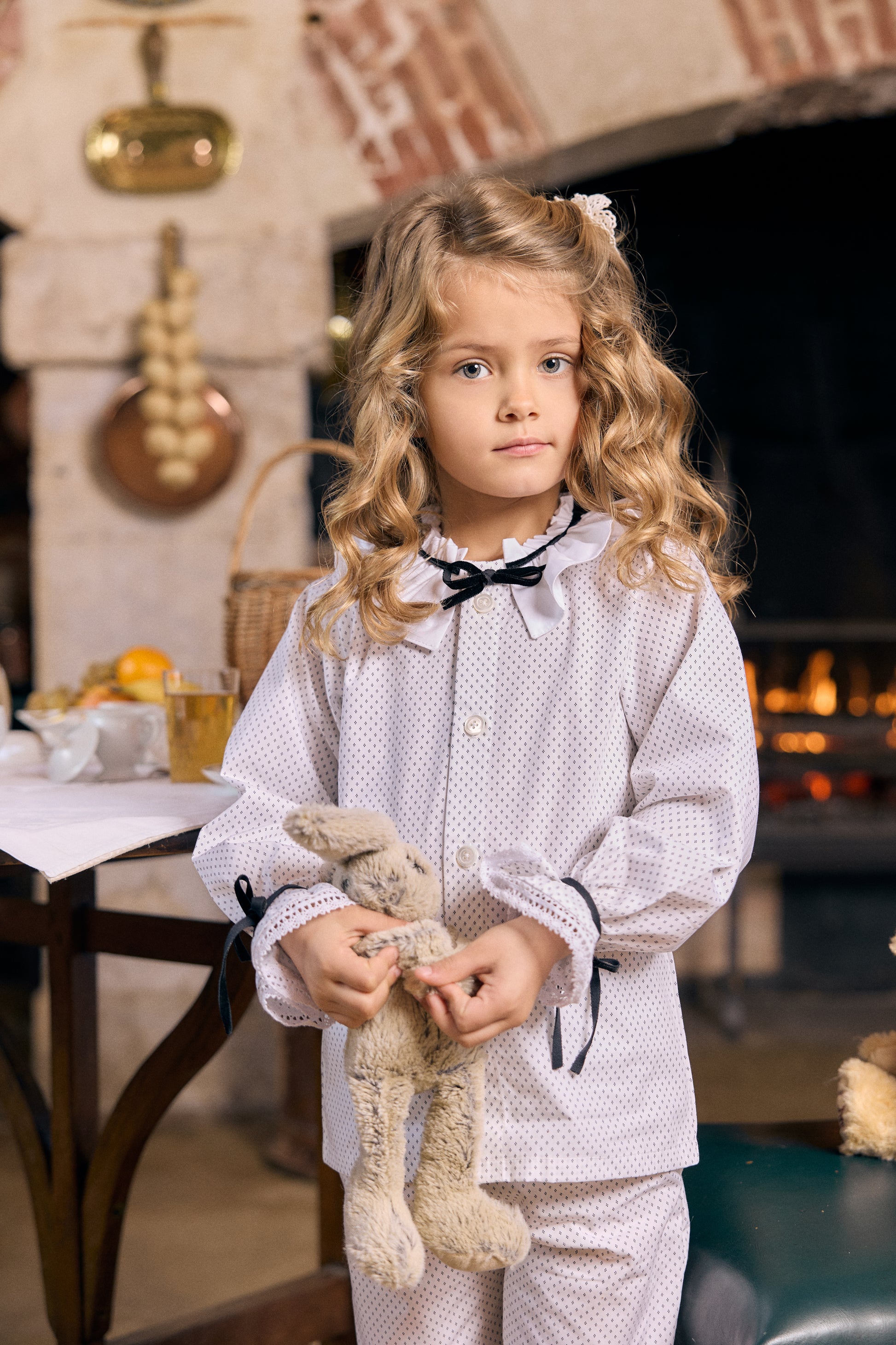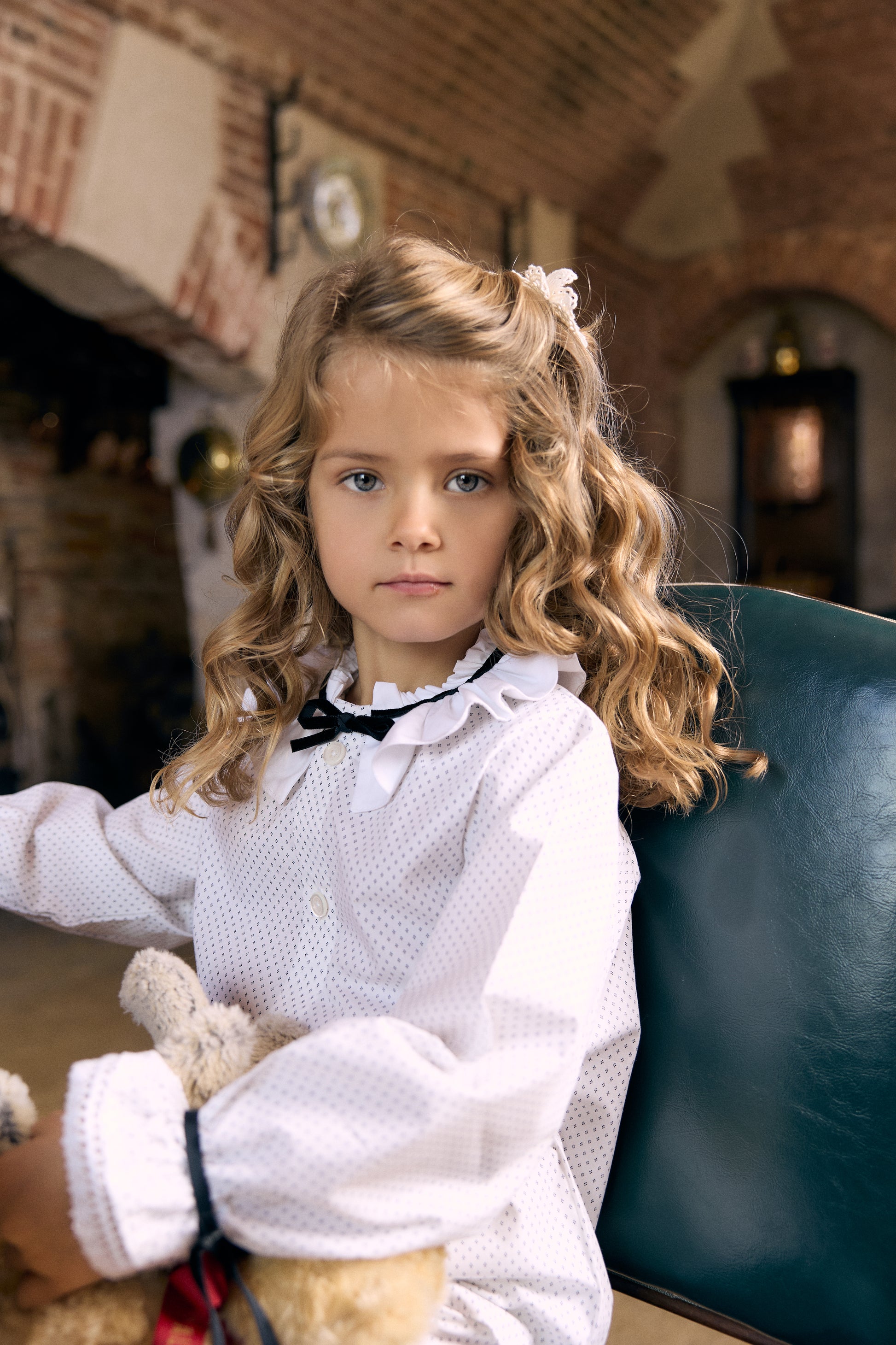 In a warm room beside a glowing fireplace, she appears dressed in a pajama dotted with tiny stars. Étoile Noire blends the softness of white with the elegance of deep black, a refined, timeless combination. The Victorian ruffled collar, gathered sleeves, and delicate black bows create a perfect contrast, like the fine details of an old portrait.