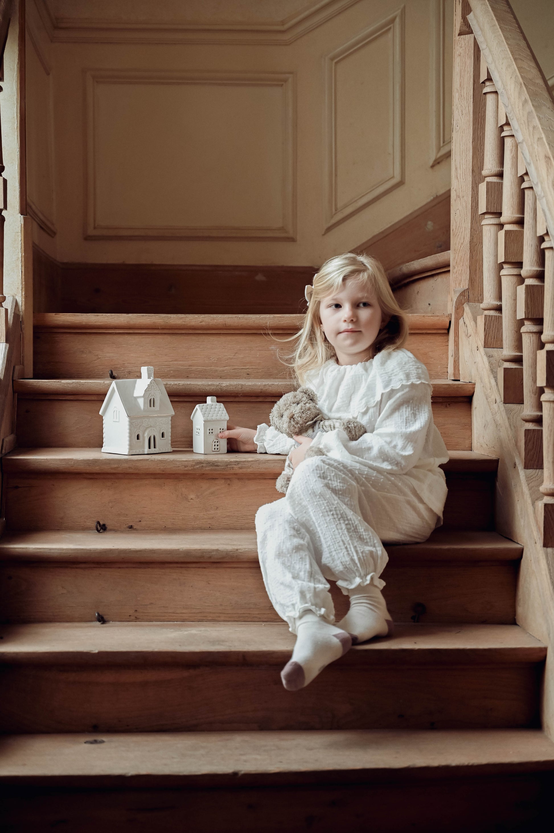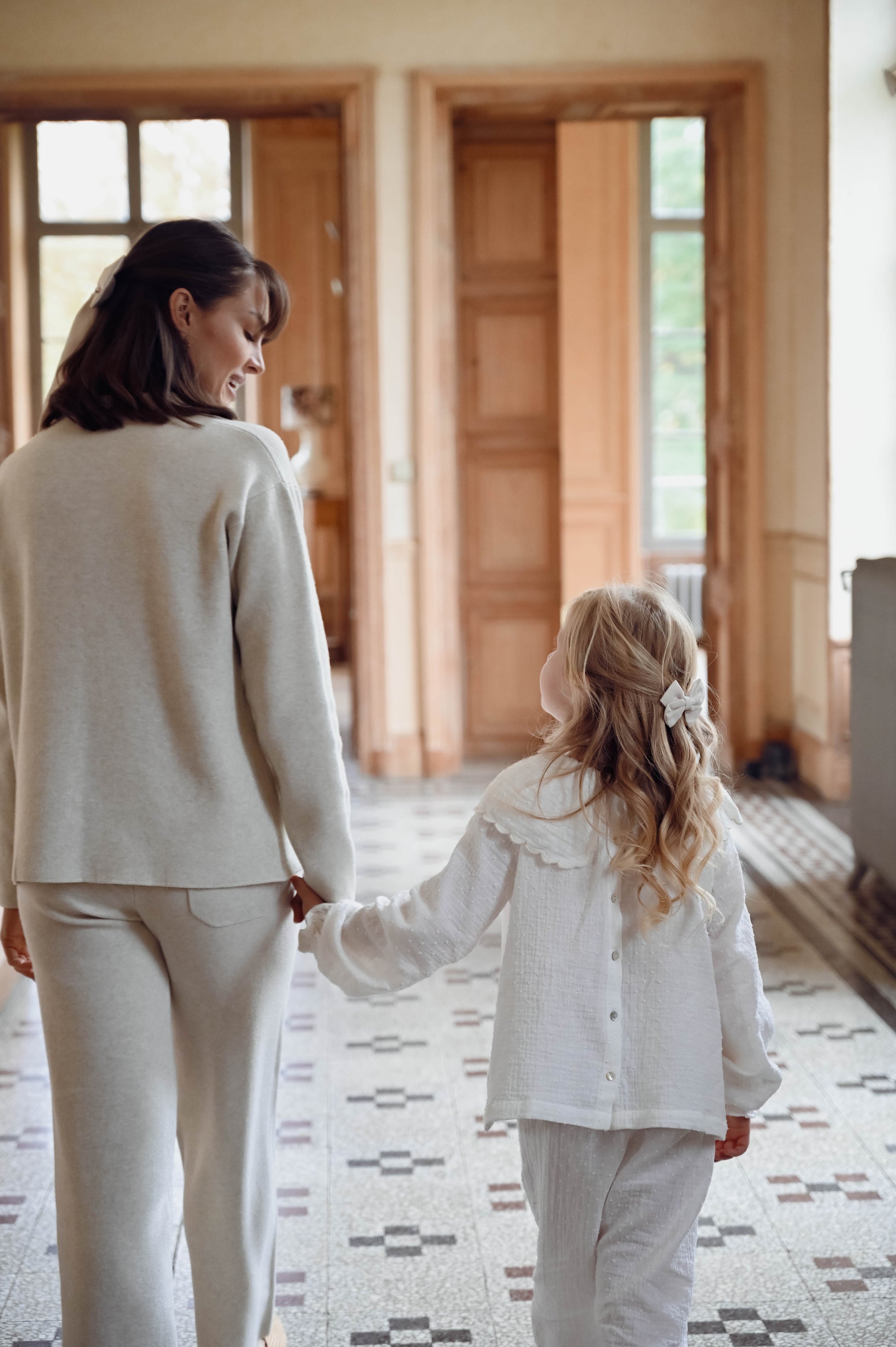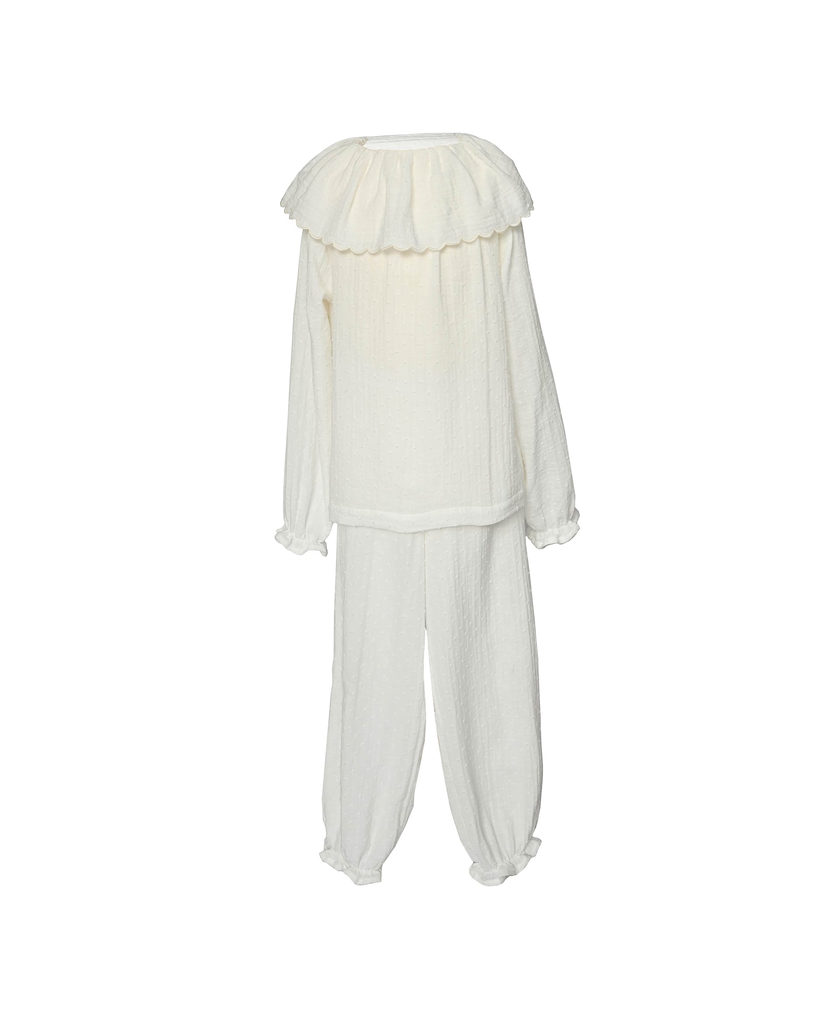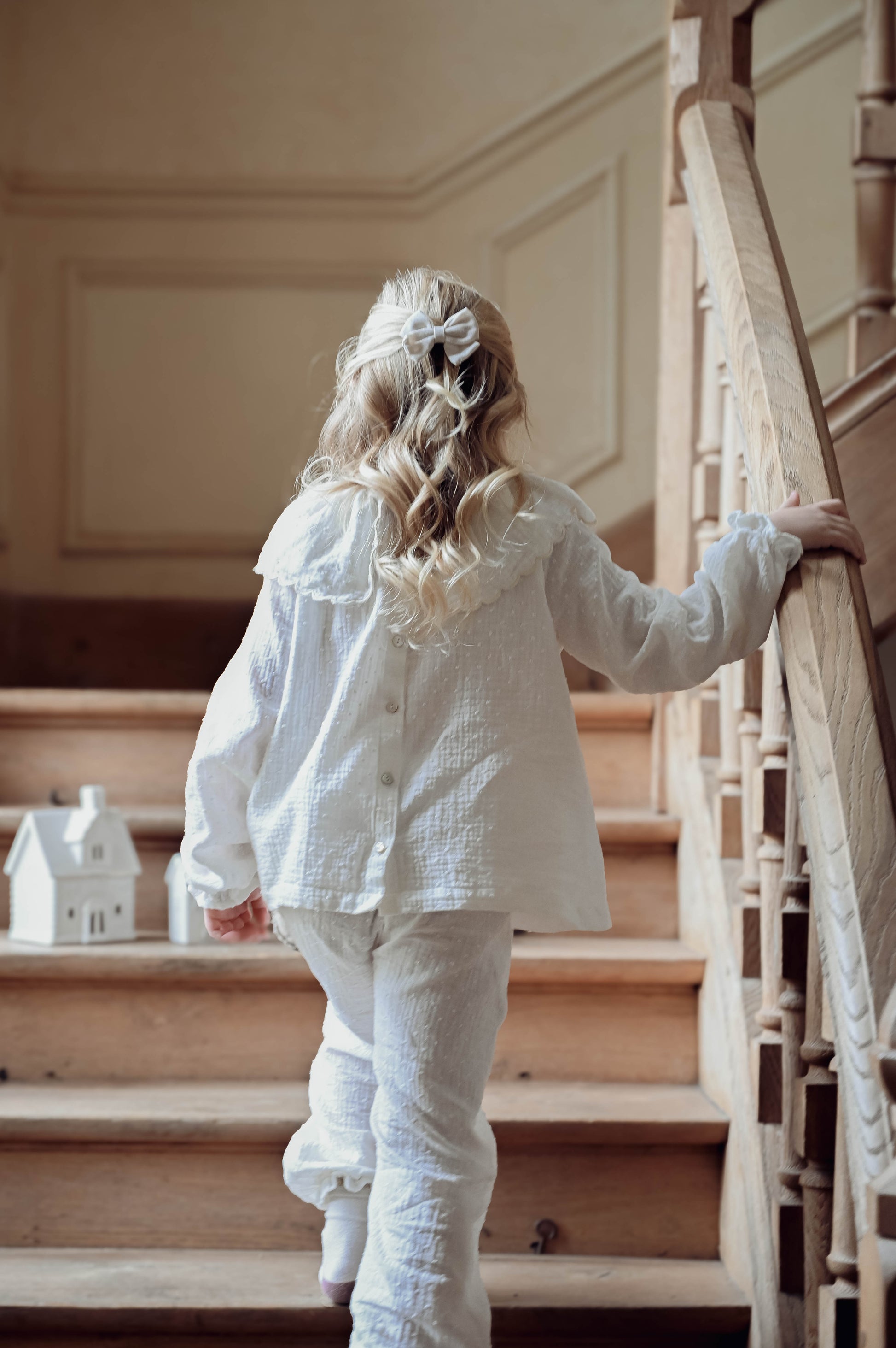Introducing our Paloma pajama set, exquisitely designed with a classic and vintage touch. Synonymous with purity and comfort for the little ones, this two-piece pajama set features a special handmade embroidery detail on the collar. The Paloma pajama is a perfect blend of timeless style and coziness, ensuring a delightful sleep experience for your little ones.