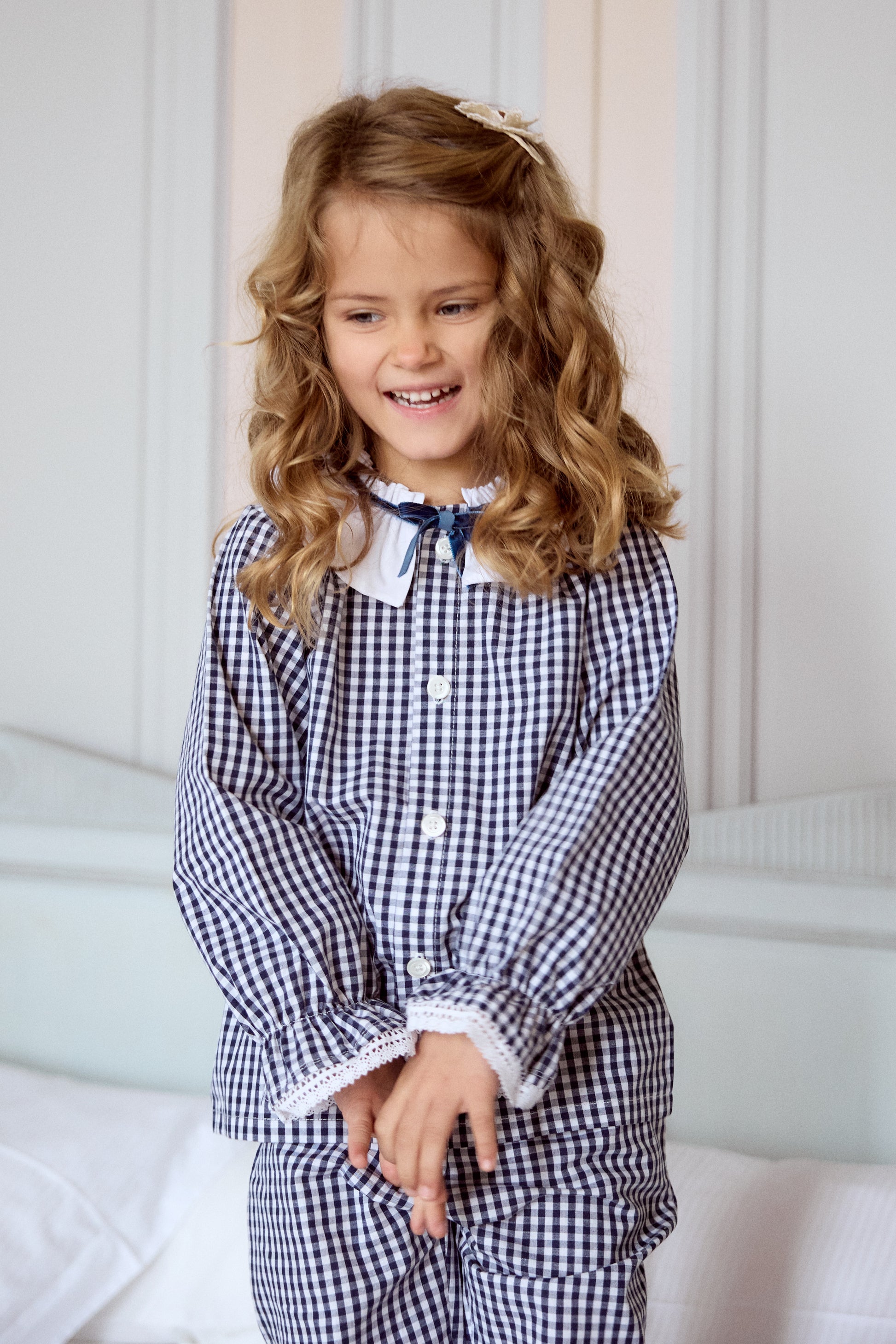 A pajama that feels lifted from a quiet French bedroom, where stories are whispered under antique lamps and childhood moves slowly. La Petite Marine blends a romantic Victorian collar with timeless blue gingham, creating a piece that is tender, elegant, and forever classic.