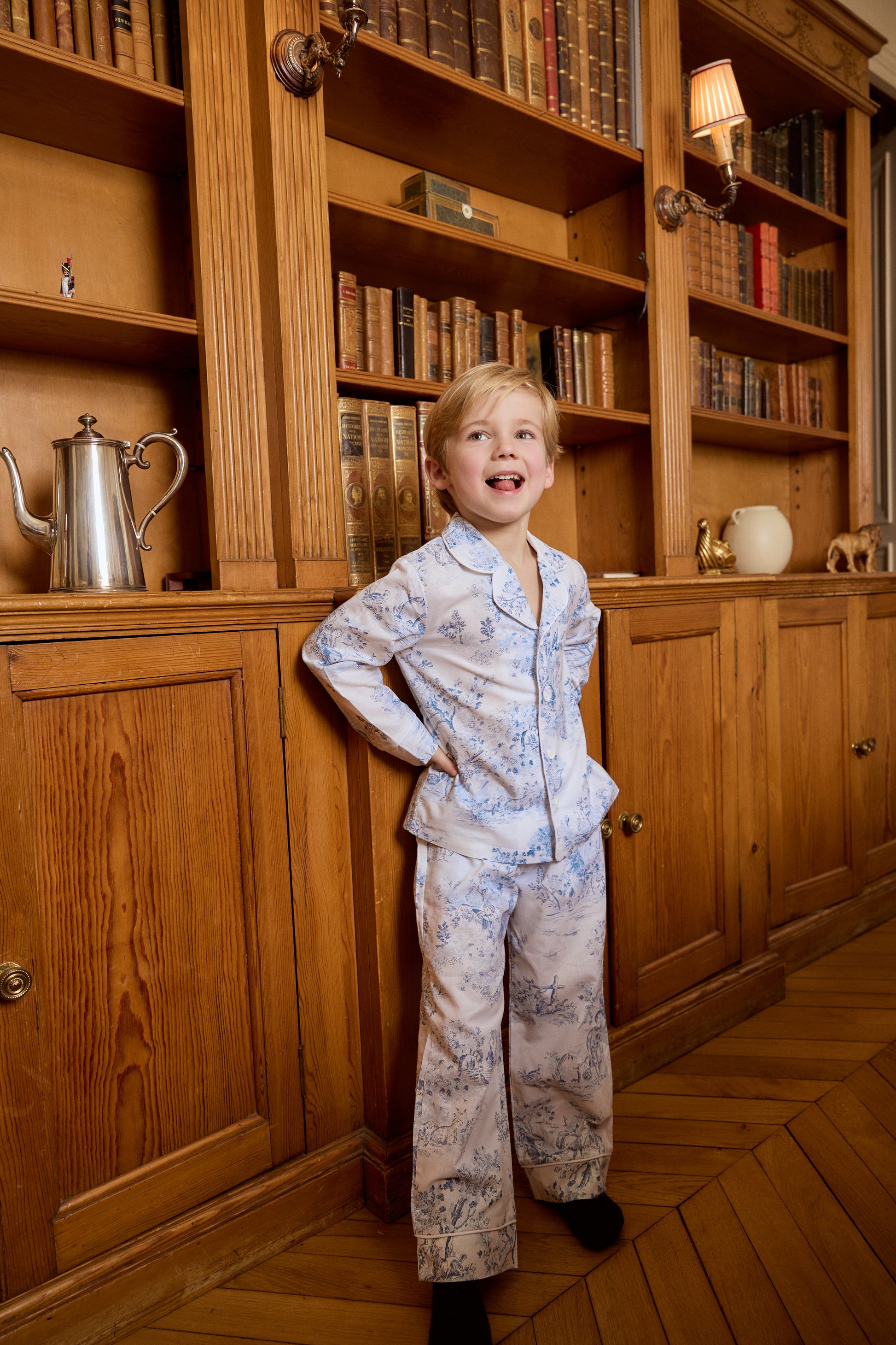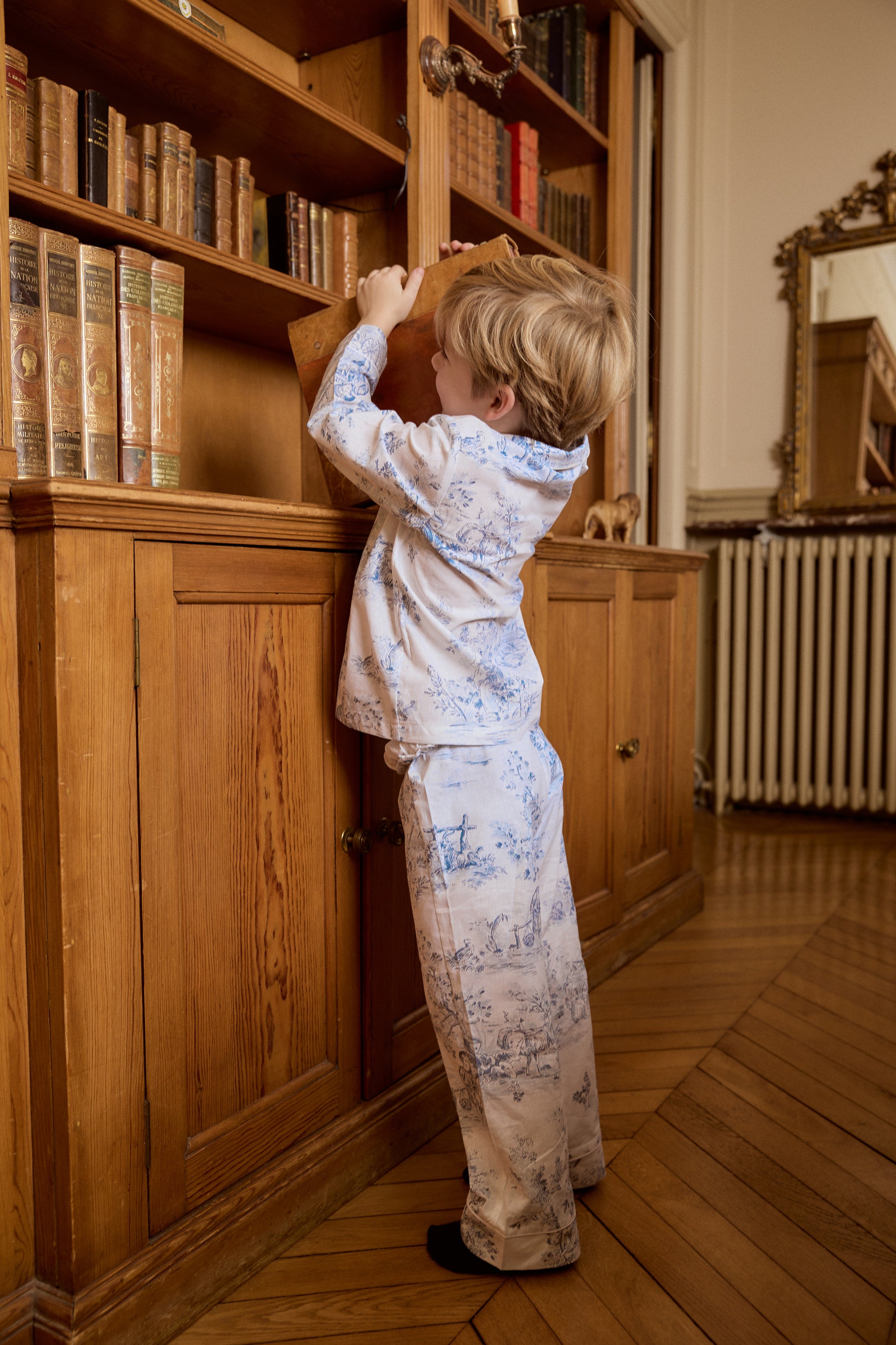 A pajama that feels like the first light of morning, where soft blue scenes unfold across crisp white cotton. Toile de L’Aube blends classic elegance with quiet charm, creating a piece that is gentle, timeless, and beautifully serene.